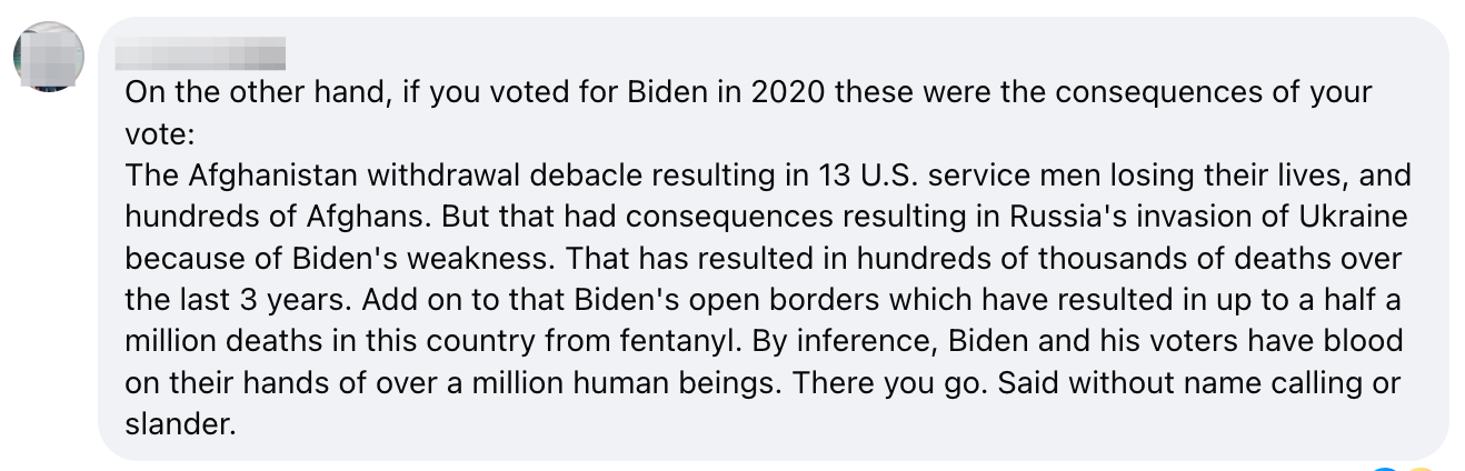 Whataboutism notwithstanding, I think it is possible to have a conversation about whether or not a Christian should have voted for Biden, but now is not the time for that conversation.